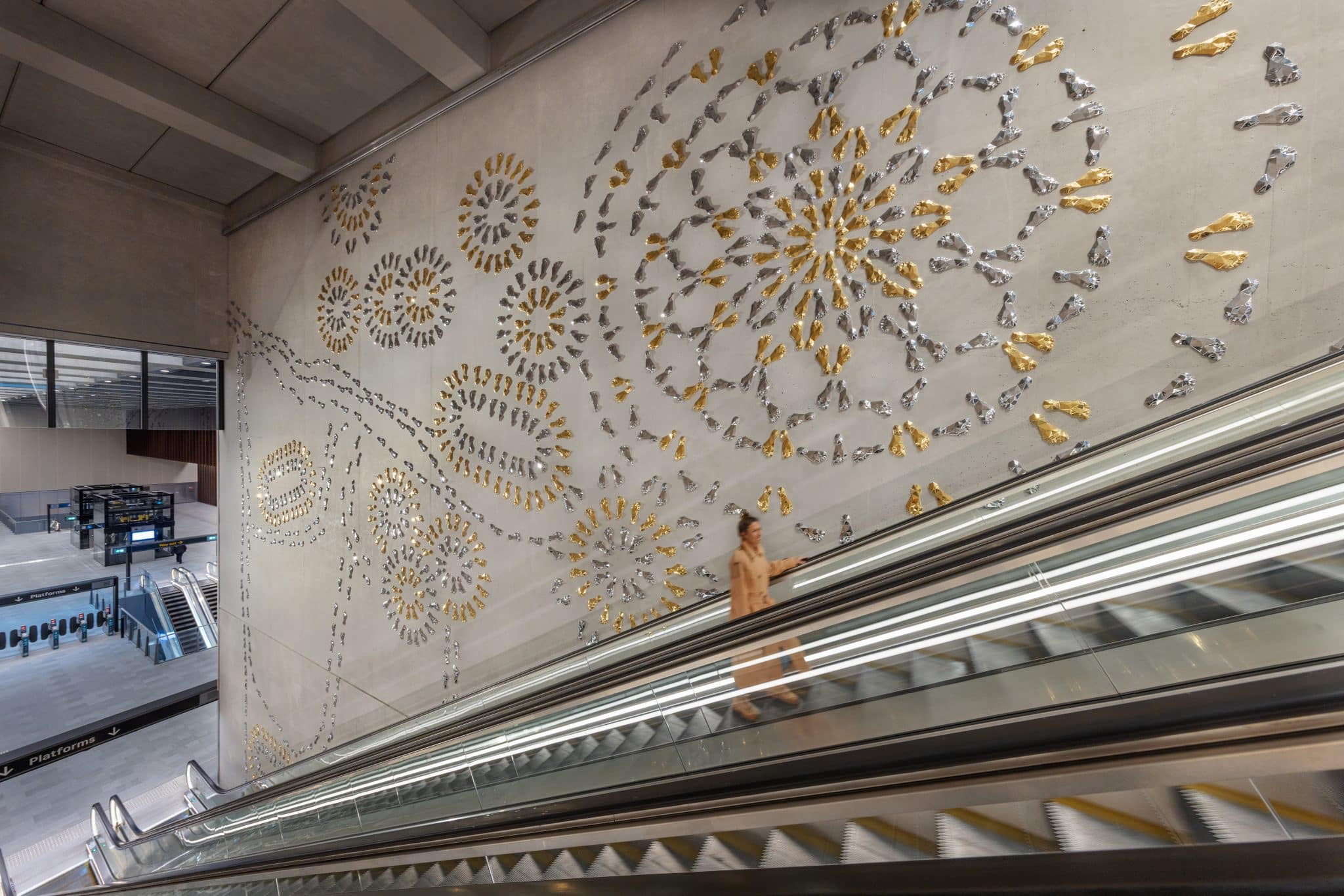 On the landing beside the escalators, more than seventy community members co-created one thousand aluminium footprints that trace culturally significant paths across the architecture.
