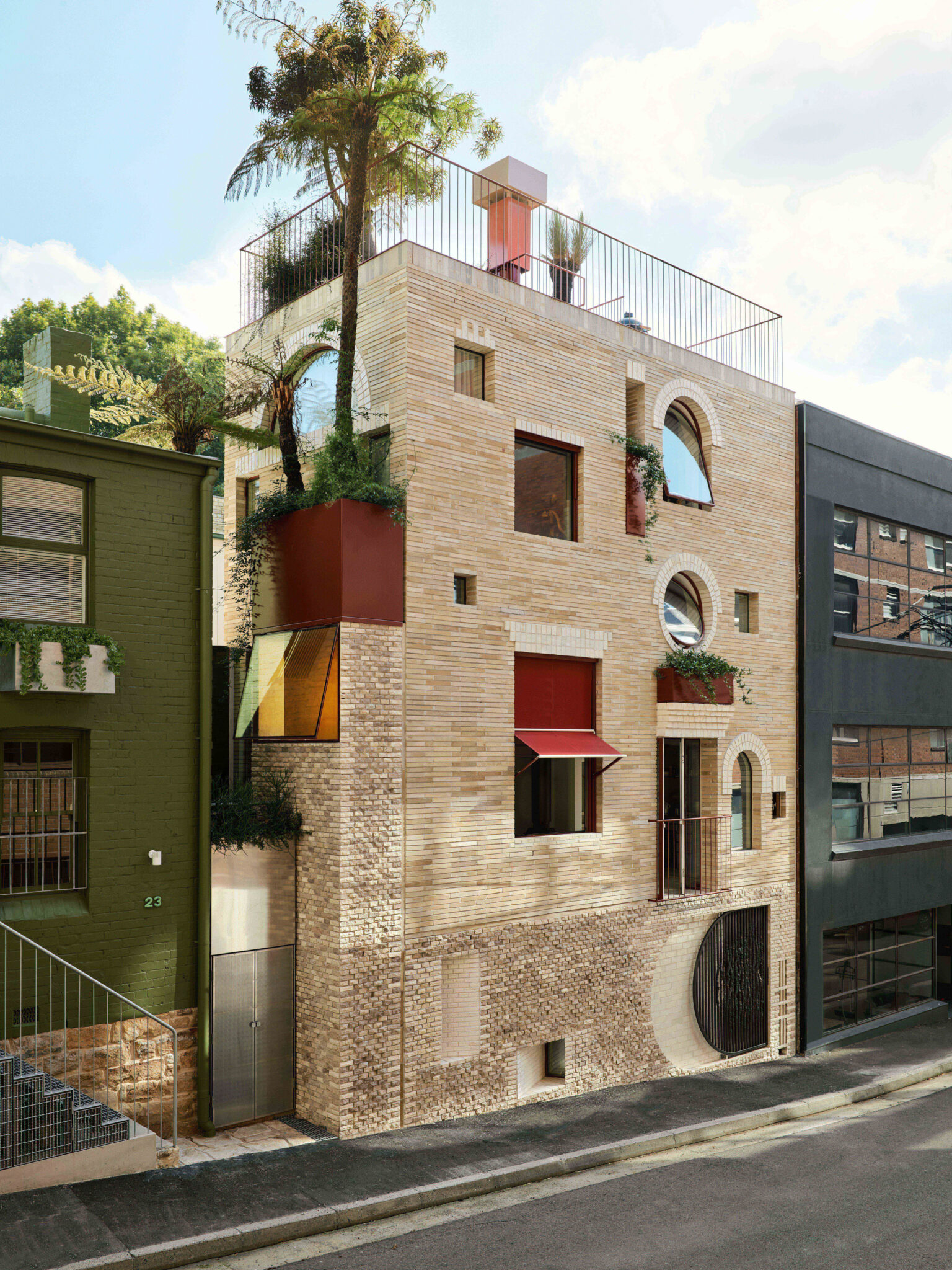 With a footprint of 30 sqm and a Jacques Tati-esque façade of recycled and broken brick, this house playfully engages with the street through arrangement and geometry of openings. Ultimately, it’s about sustainability, doing more with less, reusing a site, reusing materials, and better using an existing connected place.