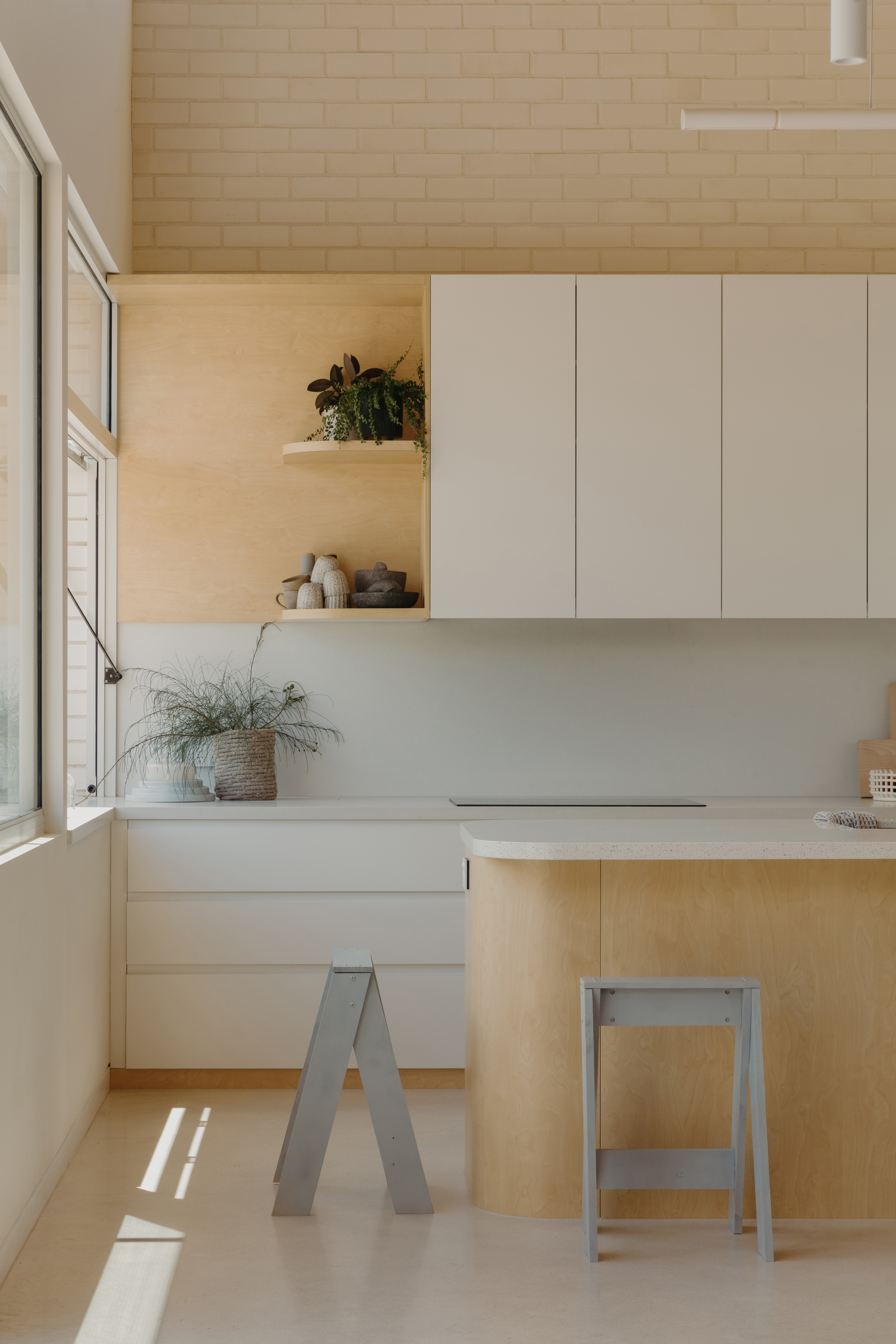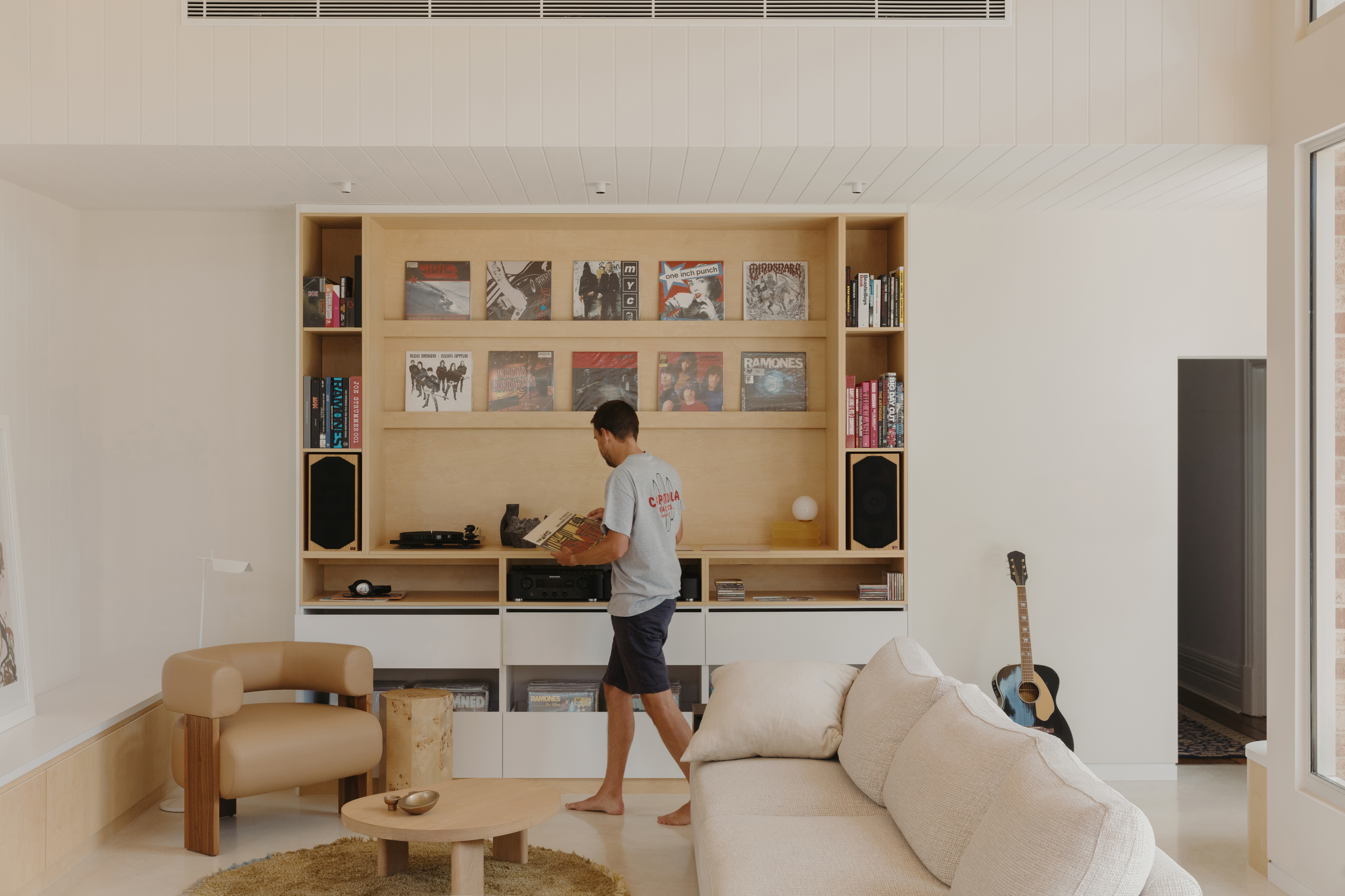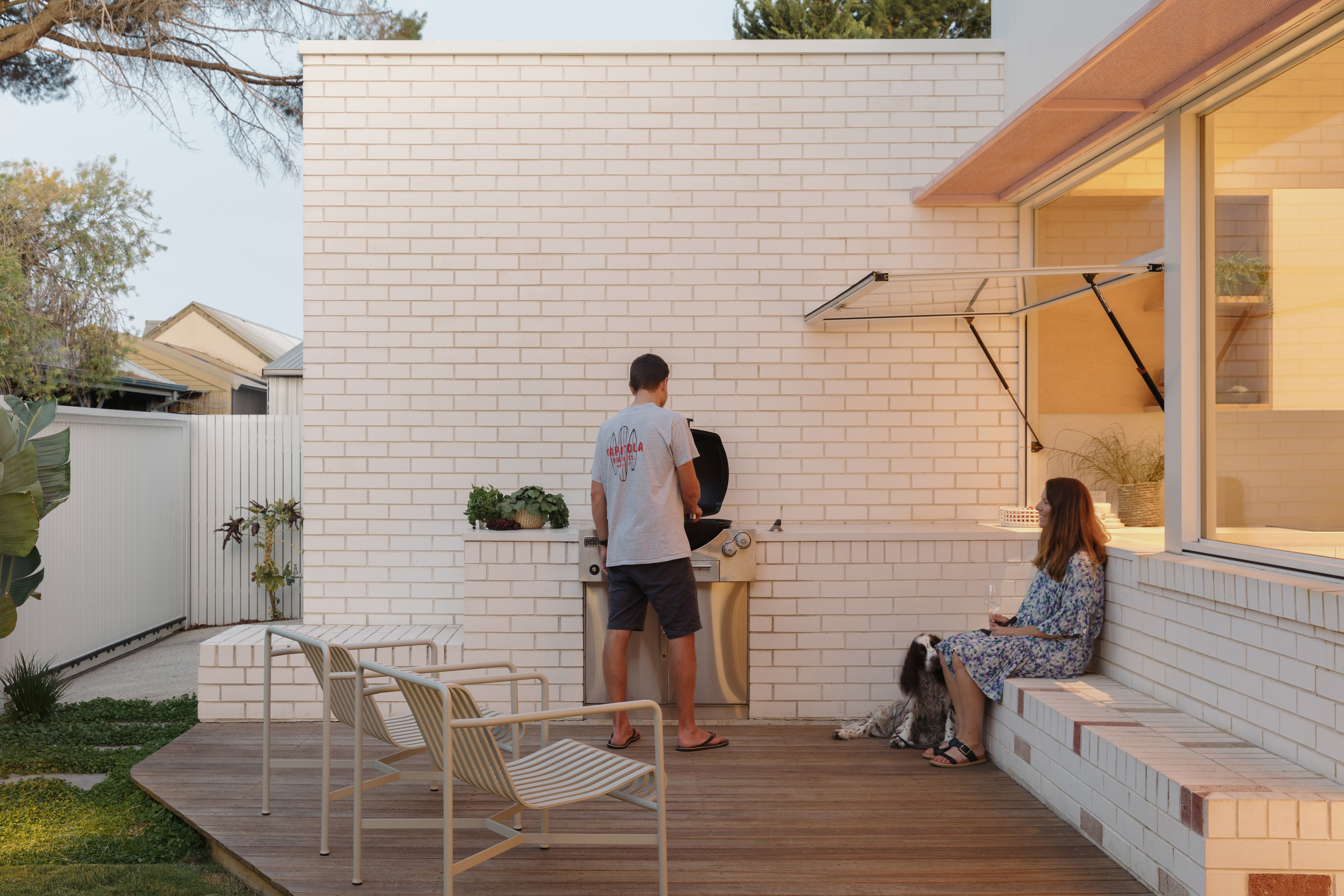 • • Laneway Activation: The design reorients the home to face a service laneway, creating a social threshold and drawing light and community into daily life setting a precedent for overlooked suburban edges providing strong pedestrian connections to the abundant local amenity. • Community Impact / Visual Gesture : A fading brick gradient transitions from pickets to red brick blending to white, softening the edge while referencing heritage context and solar performance. It reads as both detail, public gesture and activation to a secondary home frontage. • HiFi Station as Social Anchor: A dedicated joinery unit restores the ritual of flipping through records, making music a tactile, daily interaction. Album covers are displayed as art within the living space. Much like the fading experience of searching for music in a store. • Spatial Efficiency: The home’s compact footprint (392m² site) is resolved through careful planning—wet areas centred, private spaces retained, and living spaces positioned to the north. • Sustainability: Form of the home is driven by its response to passive heating, cooling and ventilation techniques. Thermal mass requires minimal support to provide heating and cooling. Solar supports the fully electric kitchen and powering for their Electric Vehicle.