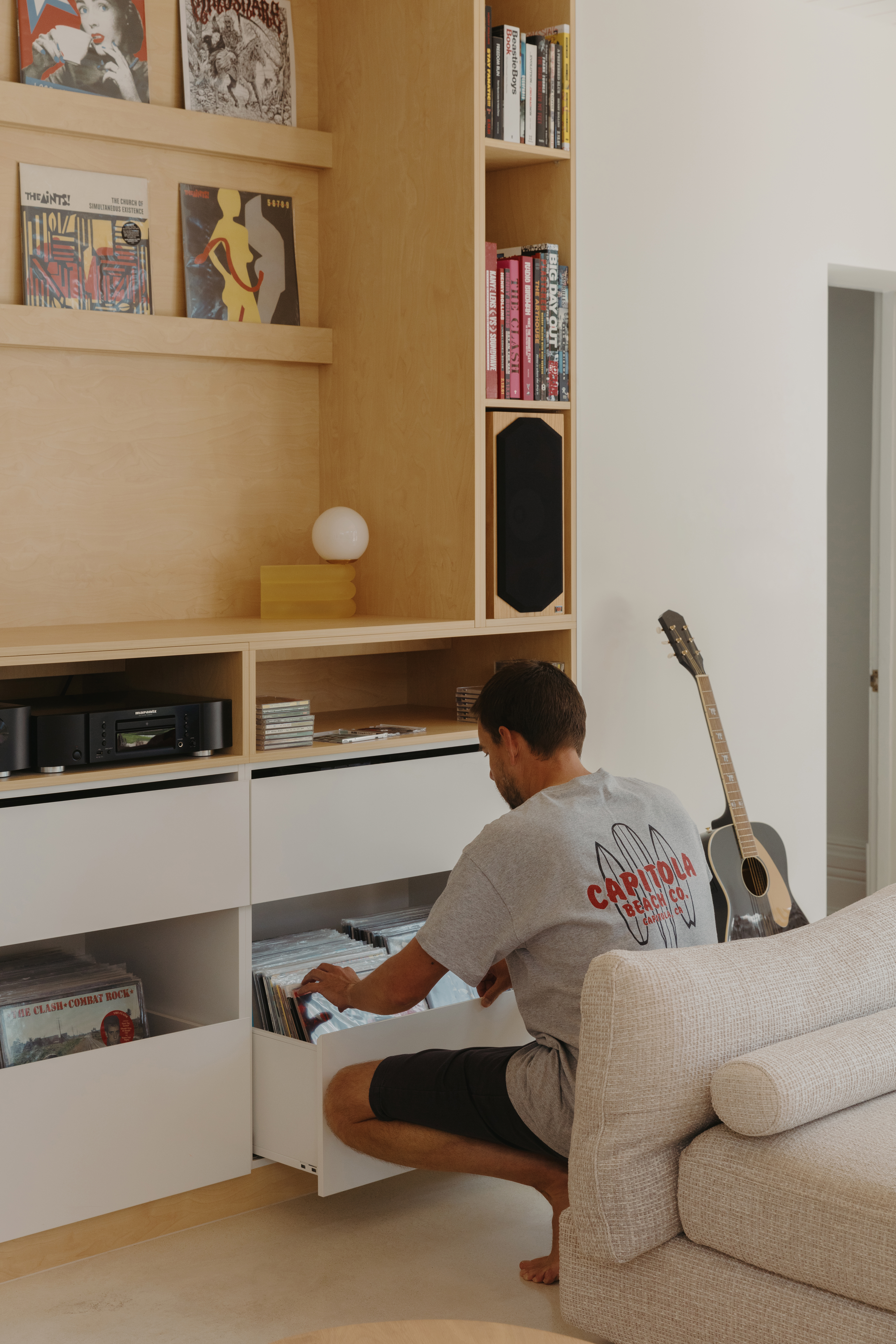 • The home reorients to the laneway, transforming a back-of-house edge into a social frontage. A new addition runs toward the southern boundary, drawing northern light into the courtyard and living areas. Amenities are placed centrally for efficient circulation, while private zones remain in the retained heritage footprint. Two anchors define the social core: a HiFi station restoring the lost ritual of flipping through records like browsing a music store and displays album covers as part of the living space; and the kitchen that frames sky and trees through operable louvres. A fading brick gradient gestures to the laneway.