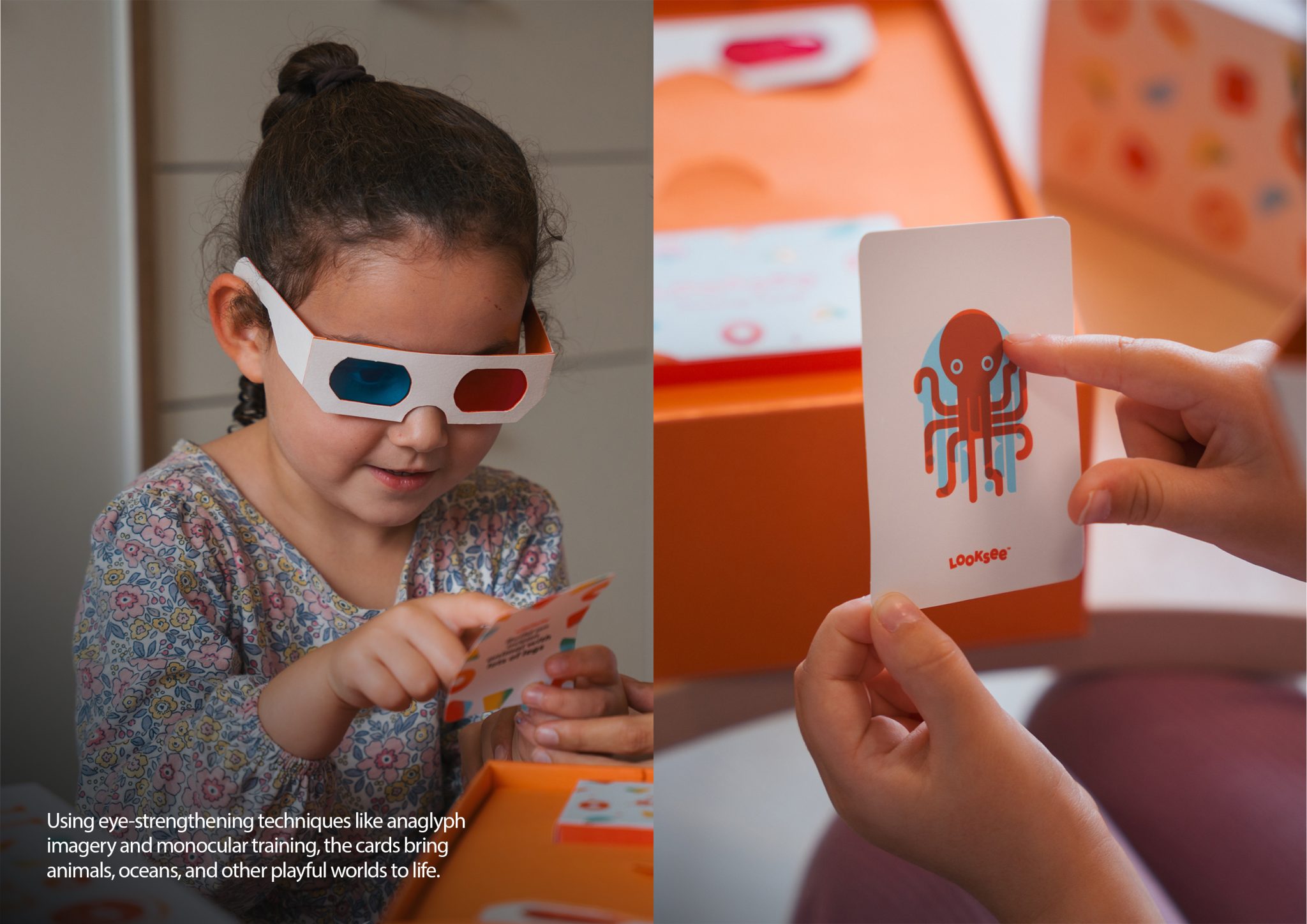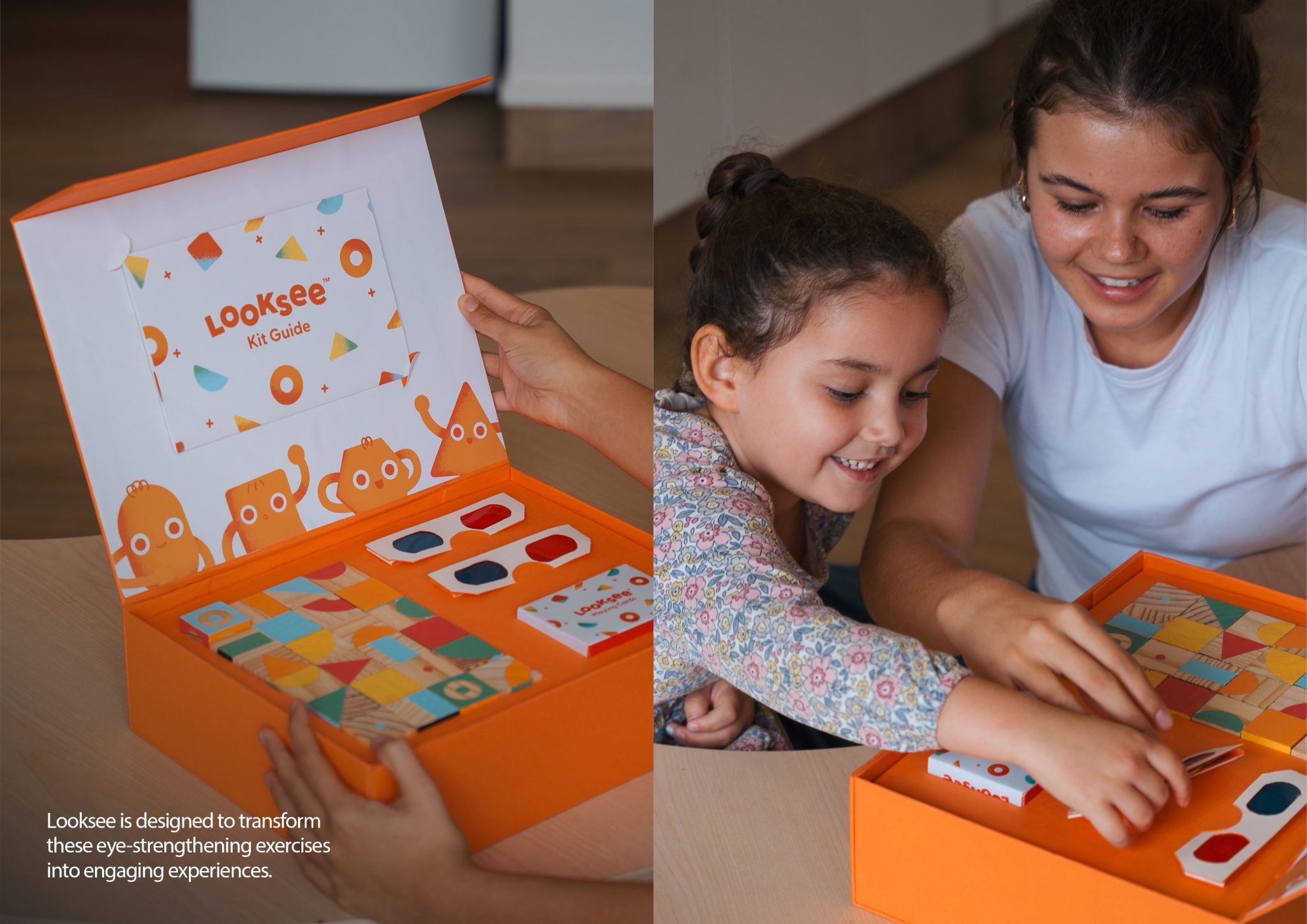 Looksee is an eye-strengthening kit for children aged 4–6 with alternating divergent squints. Designed to support at-home treatment, it replaces dreaded eye exercises with imaginative play by using red/blue glasses, cards, and pattern blocks to make treatment fun, effective, and engaging for children and parents.