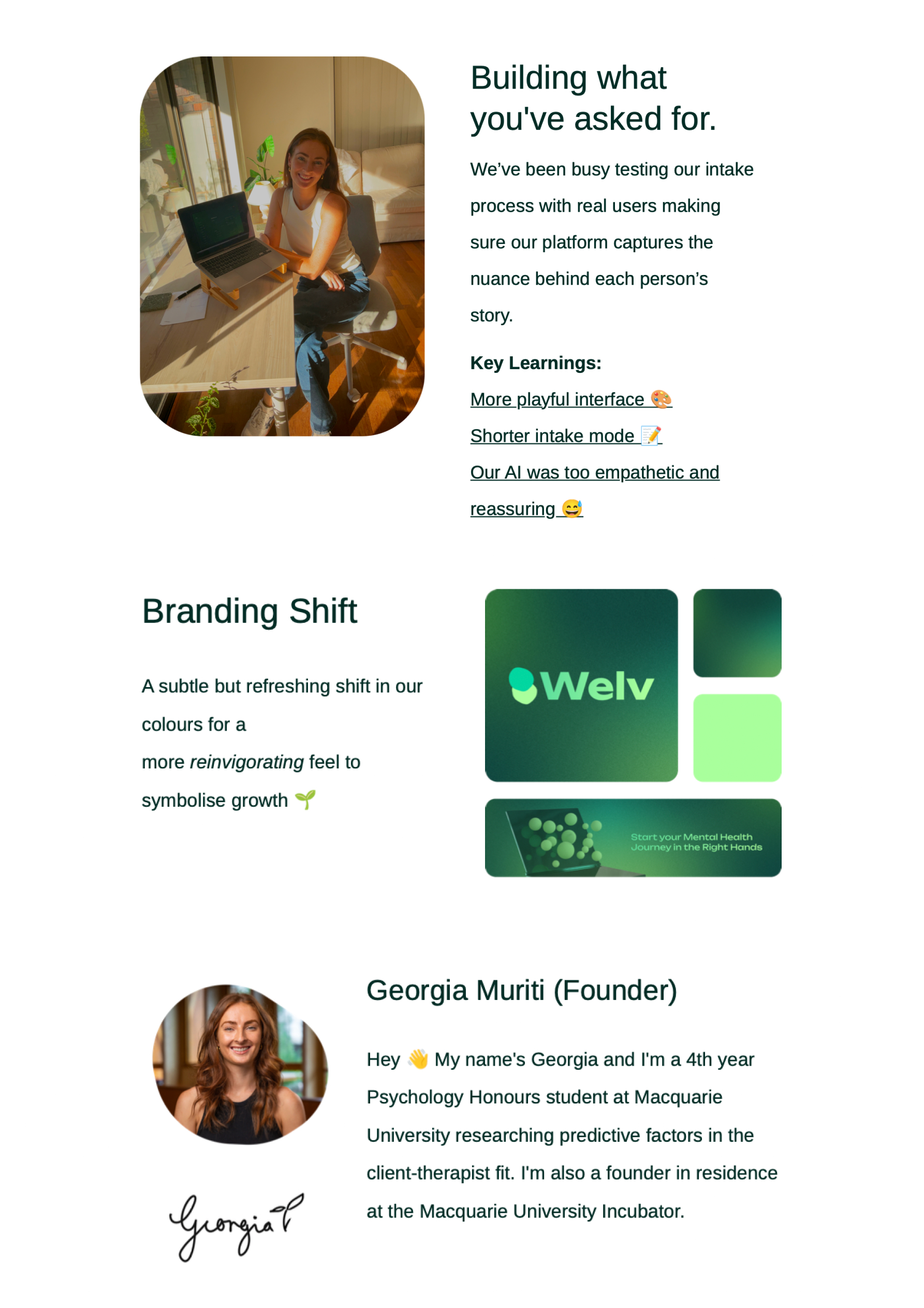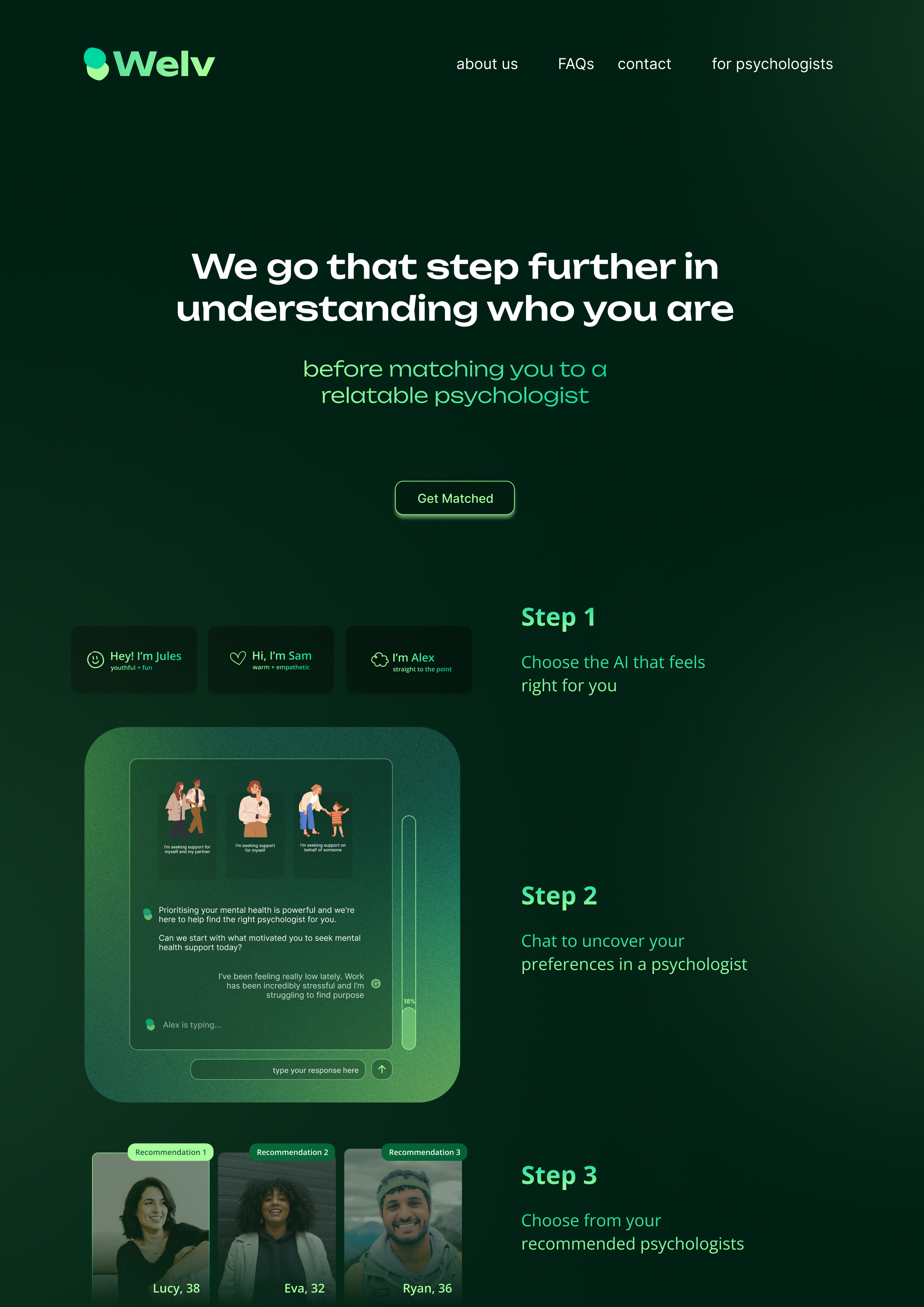 Welv is an AI-powered platform that helps people start their mental health journey in the right hands, by deeply understanding who they are before matching them to a relatable psychologist. It also supports psychologists by reducing mismatch stress and helping them work with clients aligned with their strengths and style.