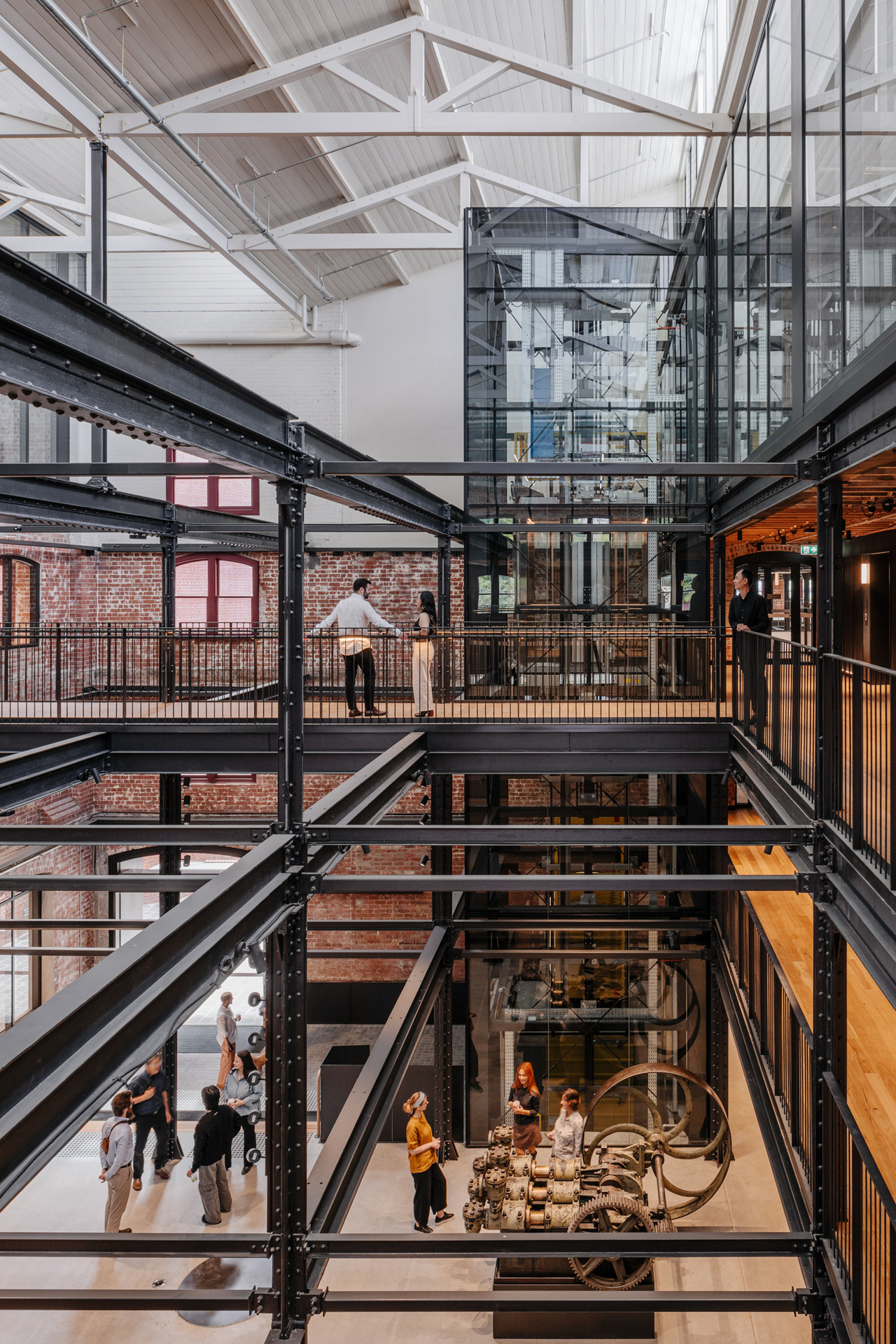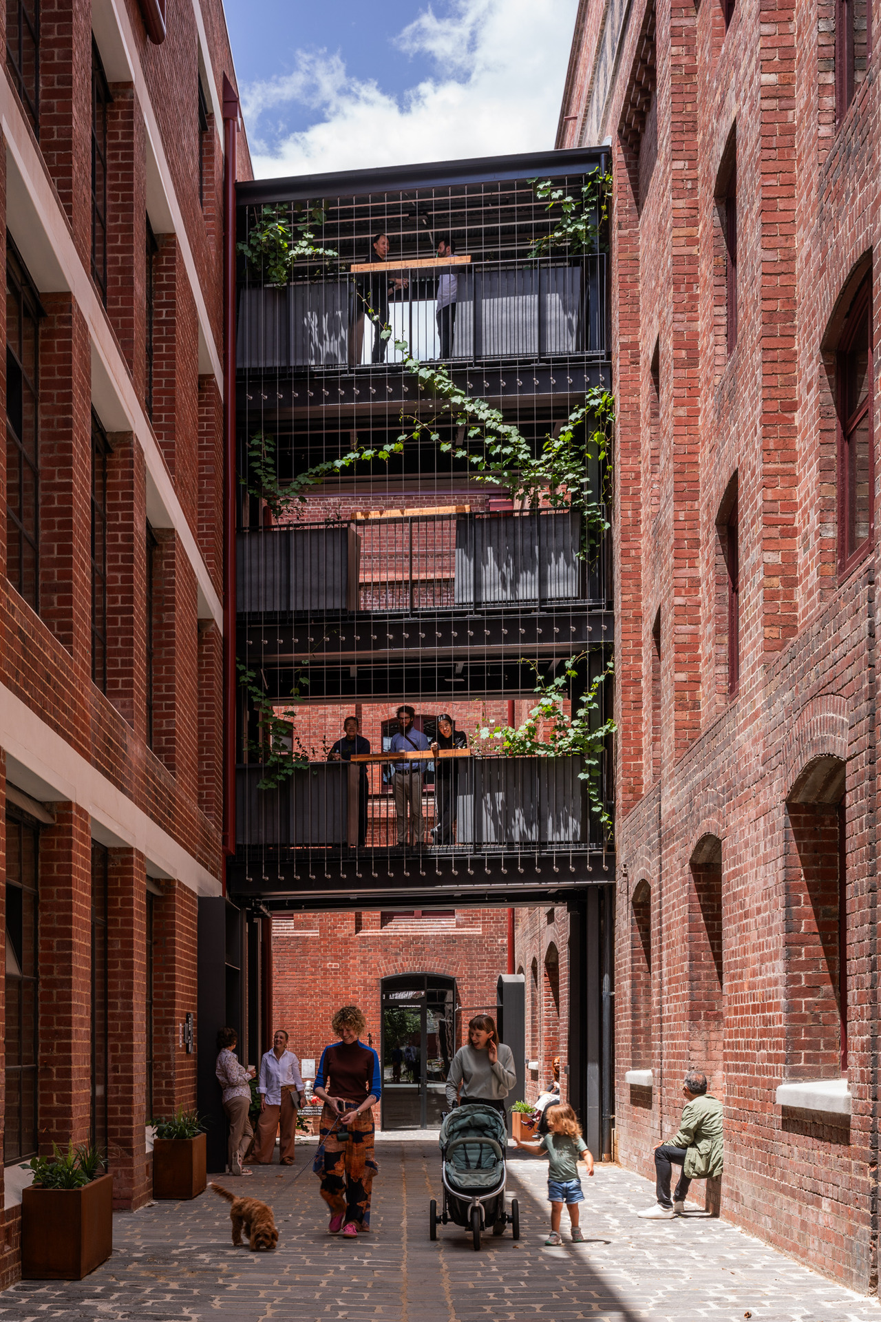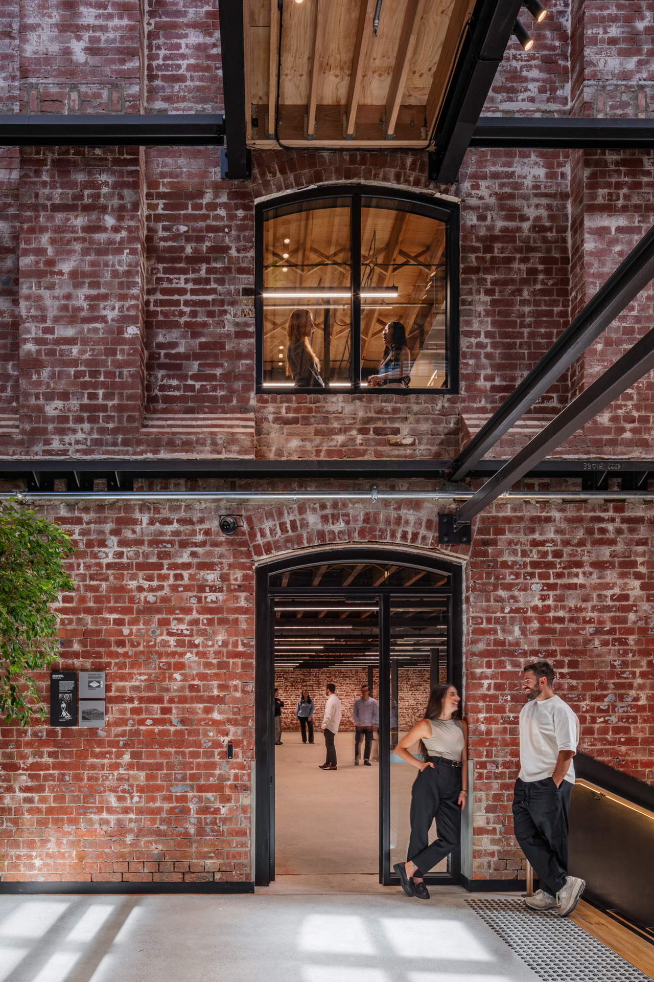 • The Younghusband Woolstore is a cherished heritage building that has long serviced the community. Woods Bagot revives and reimagines the old site, which in recent decades, had fallen into disrepair and lain mostly dormant. The new public realm interweaves a variety of public spaces, including existing bluestone laneways and new public gathering spaces. Multiple entry points have been carefully curated to provide connections, inviting public and private collaboration. The large deep floorplates host flexible workplace tenancies, with premium end-of-trip and communal amenities, for a characterful and state-of-the-art workplace. New interventions include modern glass lifts and external link bridges suspended over the bluestone laneway to improve access and add animation within the building. For the architects, the project was about exercising restraint, and celebrating the building’s scars and patina. Today, the Younghusband ghost signage is still plastered across the face of the redbrick building, the decommissioned bale lifts and pastoral paraphernalia documenting a life of uses long eclipsed. Woods Bagot looks at heritage more than a façade: the team extends adaptive reuse to include structures that were once overlooked, in the hope this project will inform newcomers about the history that once took place there.